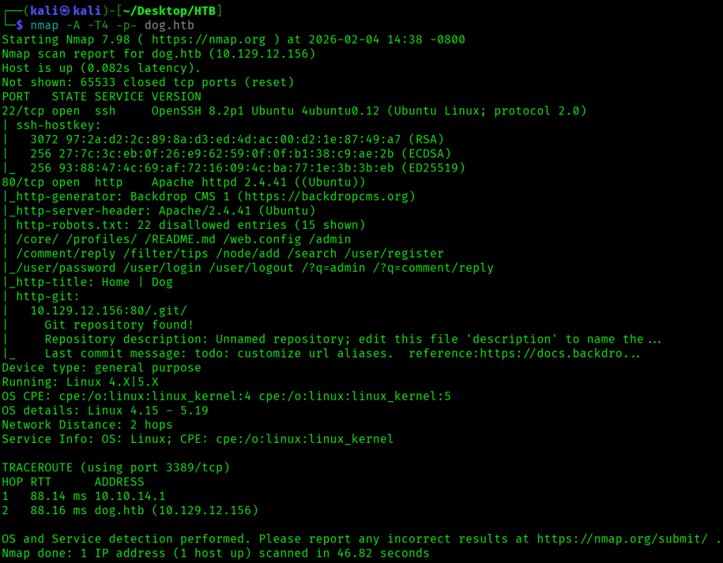 I started this machine by adding dog.htb to /etc/hosts and ran nmap -A -T4 -p- dog.htb to see what ports were open and do some basic enumeration.