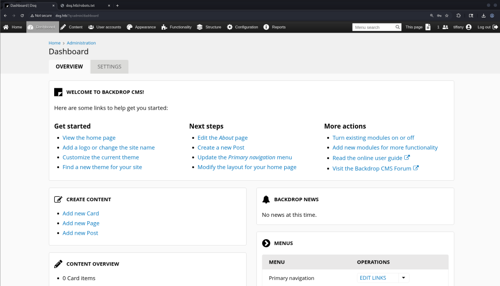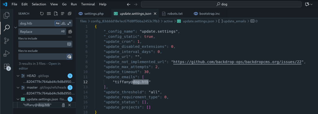I looked through the repo, and searched in VSCode with the term dog.htb, and found an email address tiffany@dog.htb.