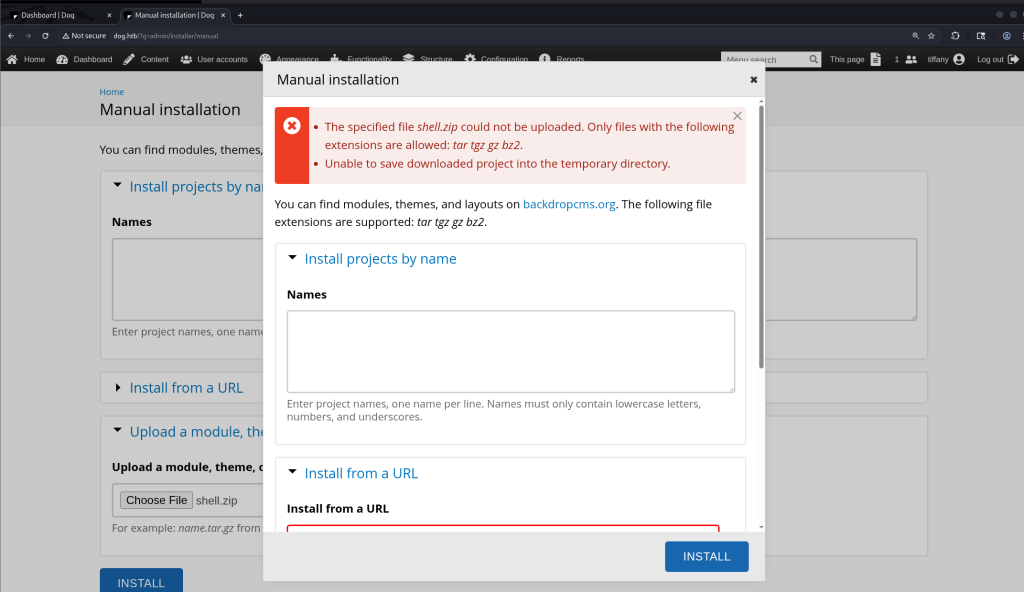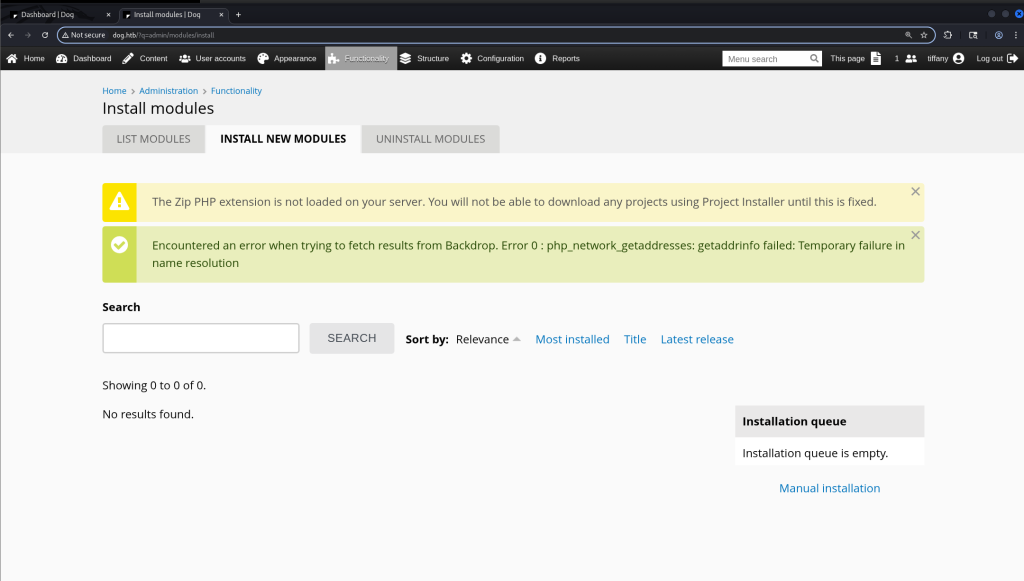 I went to http://dog.htb/?q=admin/modules/install to upload the ZIP file created from this exploit, but got a warning that the Zip PHP extension wasn’t loaded.