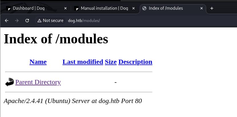 To see if there were any subdomains, I ran wfuzz -c -w /usr/share/wordlists/seclists/Discovery/DNS/subdomains-top1million-110000.txt -u 'http://dog.htb' -H "Host: FUZZ.dog.htb" --hw 761, but didn’t find any.