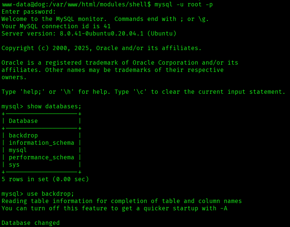 Since I had database credentials, the first thing I did was to investigate what was in the database, starting with running mysql -u root -p with the MySQL password I found earlier. I found a backdrop database.
