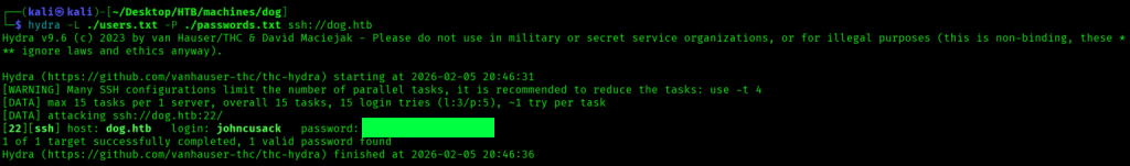 I ran hydra -L ./users.txt -P ./passwords.txt ssh://dog.htb to see if any username and password combinations from these lists would get me an SSH session, and found a valid password for johncusack (the original MySQL password).