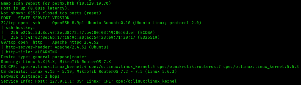 To do a more complete enumeration of ports and services, I ran nmap -A -T4 -p- permx.htb.