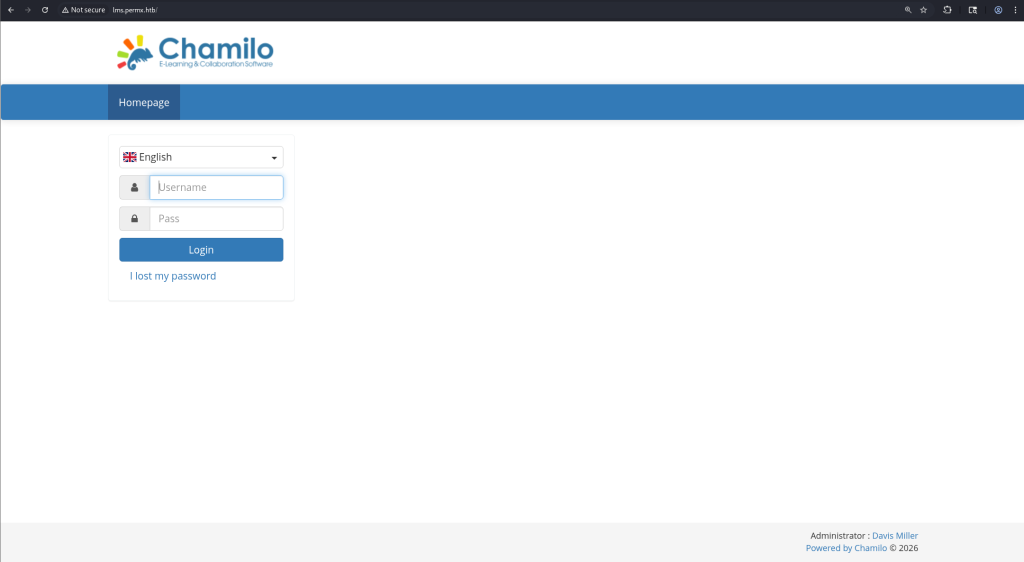 lms.permx.htb ran a Chamilo page, and the page at / contained a login form for the e-learning platform. Trying to login with basic default credentials like admin:admin wasn’t successful.