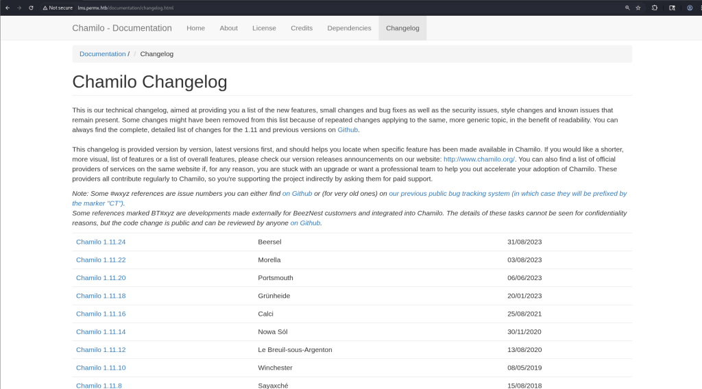 Navigating to http://lms.permx.htb/documentation/changelog.html also gave the patch version of Chamilo, which was 1.11.24.