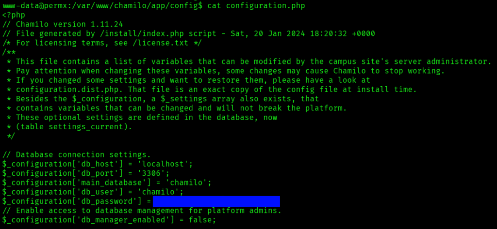 Now that I had a shell on the system, I looked around the chamilo app in /var/www/chamilo for any interesting files, and found database credentials in /var/www/chamilo/app/config/configuration.php.