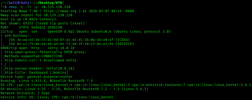I started this machine by running nmap -A -T4 -p- 10.129.230.220 to enumerate ports and services on the host.